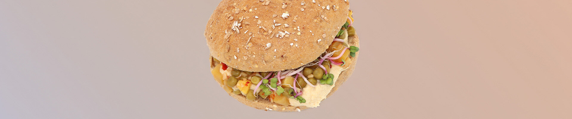 Unser veganes Hamburgerbrötli wird für den Burger Veggie gefüllt mit feinem Hummus, marinierten Erbsen, Mangostückli und würzigen Sprossen.